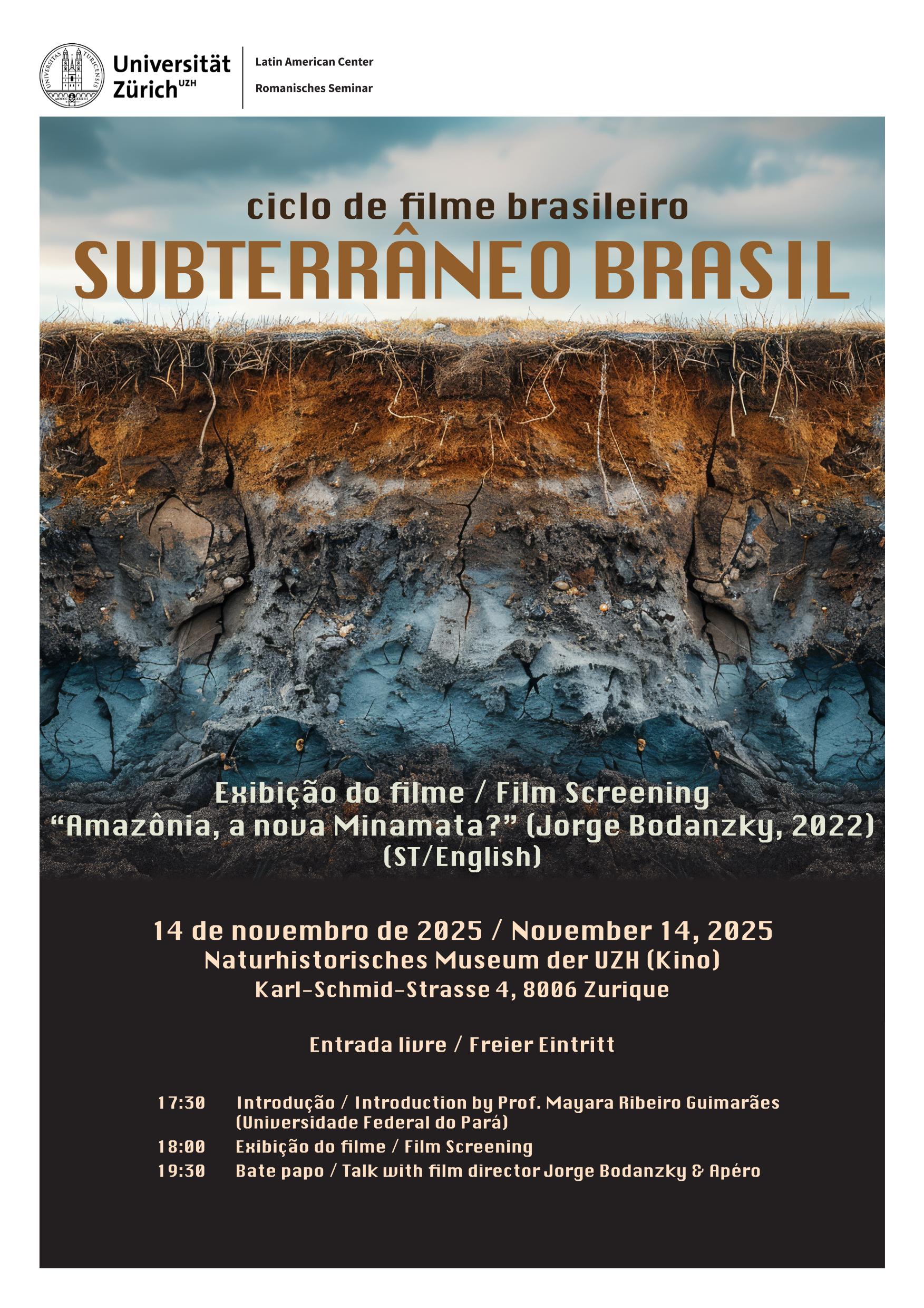 “Subterrâneo Brasil” is a pilot project for a Brazilian film series, which aims to screen one film every semester. The main objective of the event is to foster discussion about the Brazilian cultural context, based on cinematic aesthetic expressions, whether in the field of fiction or documentary, that address social, political, and/or environmental issues in the region. This aspect is evident in the very title of the activity, which stems from the urgency to review and highlight the tensions of contemporary Brazil in its most distinct spectrums, which are buried either by official discourse or by the naturalization and historical systematization of inequalities in the country, which, in turn, are connected to the current phase of neoliberal capital. The first part of the series aims to address the issue of the socio-environmental impact of extractivism in the Amazon region. To this end, we have chosen the documentary “Amazônia, a nova Minamata?” (2022), by Jorge Bodanzky, a Brazilian filmmaker who has been discussing the impact of extractive capitalism in the Brazilian Amazon for decades, whether in the field of logging or mining. The documentary follows the saga of the Munduruku indigenous people as they attempt to contain the destructive impact of gold mining on their ancestral territory, while revealing how Minamata disease, resulting from mercury contamination, now threatens the inhabitants of the entire Amazon region. We believe that the screening of this film, preceded by a brief presentation by a guest researcher, will contribute to a reflection on topics such as (neo)extractivism and the systemic decimation of indigenous peoples, in addition to promoting a critical look at the water and soil crisis that plagues the entire Amazon region.
