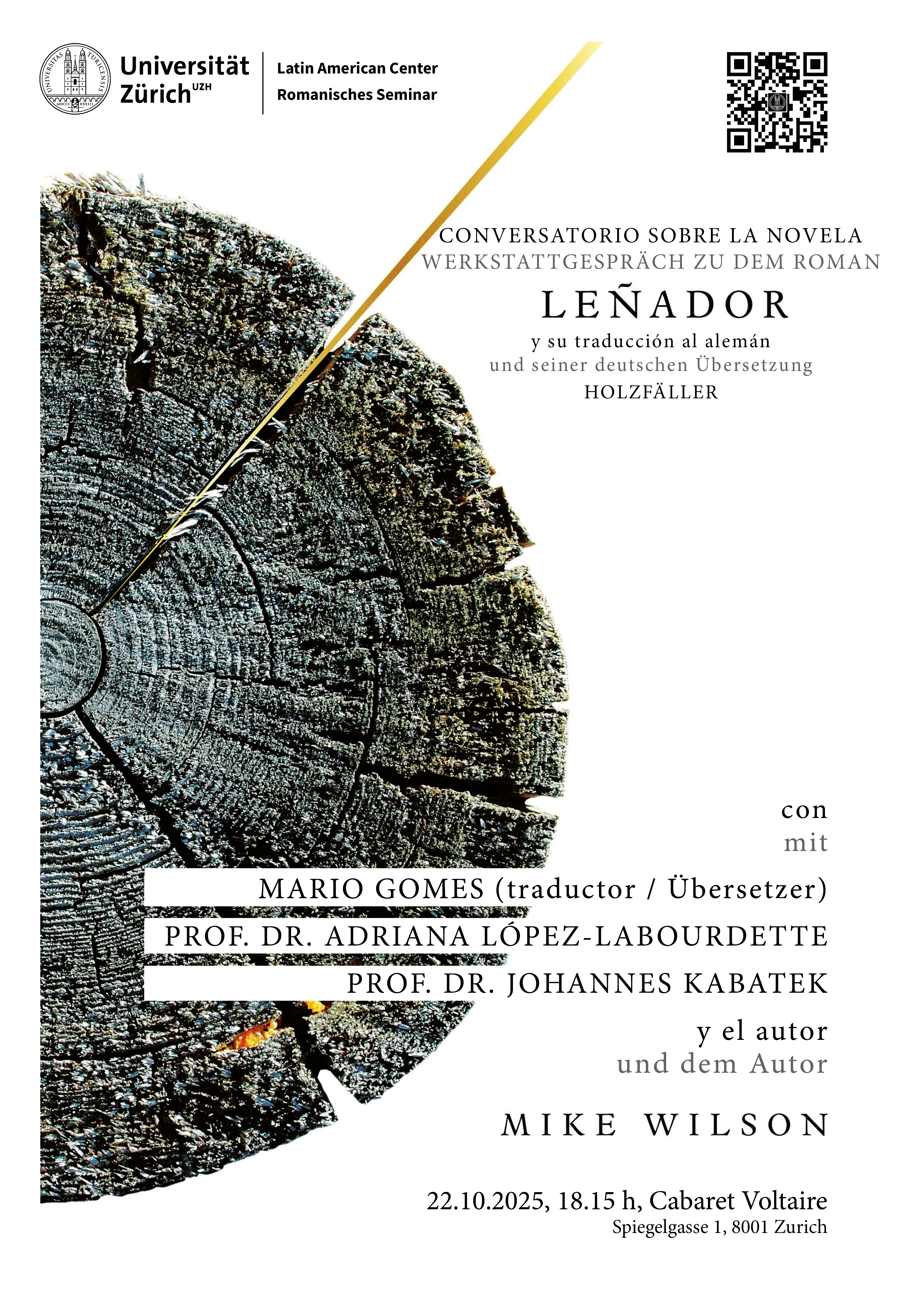 Conversatorio (JPG, 3 MB) sobre la novela "Leñador" de Mike Wilson y su traducción al alemán. Con Mario Gomes (traductor), Prof. Dr. Adriana López-Labourdette, Prof. Dr. Johannes Kabatek y el autor Mike Wilson.